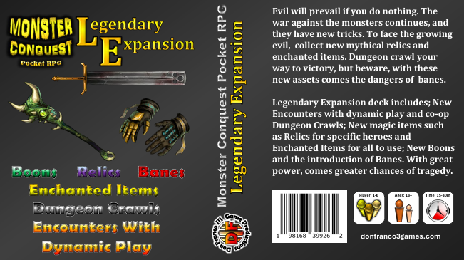 Dual Pack: Original Monster Conquest Pocket RPG & Legendary Expansion Pack $30.00 Legendary Expansion: Monster Conquest Pocket RPG $12.00 Monster Conquest: Pocket Role Playing Game (Card Game) $25.00